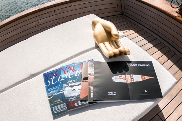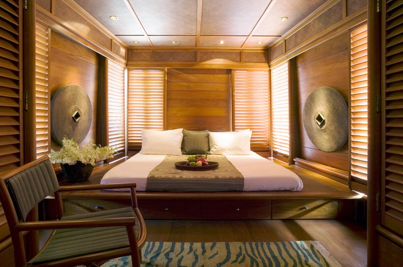The interior is mostly a neutral palate with accents provided by authentic Southeast Asian antiques from the 18th Century. Seamlessly, the ancient and modern interact in the saloon where bespoke designed louvered cabinet hides sound systems and glassware and the staterooms are adorned with tiger-patterned rugs by Jean-Michel Beurdeley.