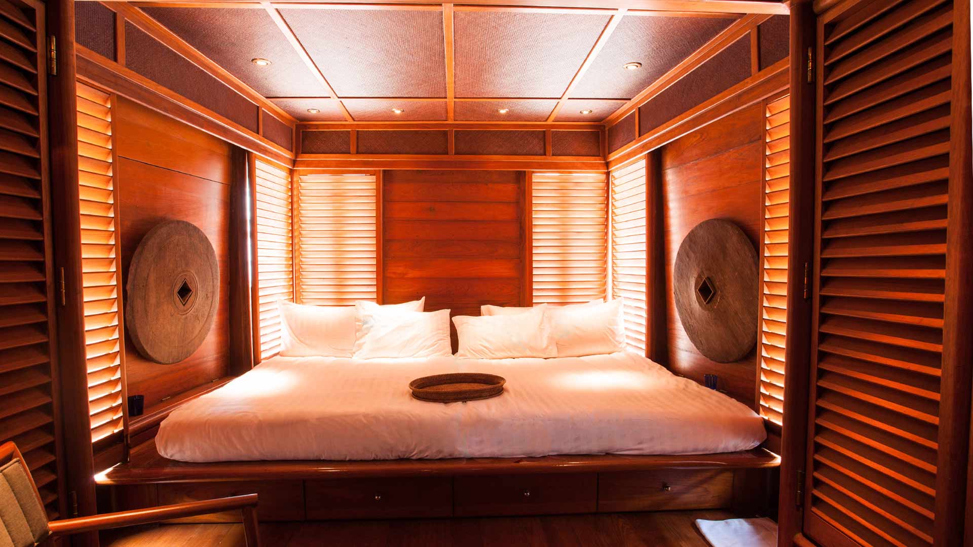 Designed by American Ed Tuttle, Maha Bhetra is a unique 90ft Thai-crafted wooden hull motor yacht that features three palatial double cabins below a spacious open-plan teak-laden saloon on the top deck. Its sturdy construction will take its guests in the Andaman sea.